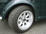 パナスポーツ13インチアルミホイール、フロントスタビライザー、ルーキータイプステンマフラー、ジョンローズ製サイドステップ、2本積みルーフキャリア、アルミペダル
